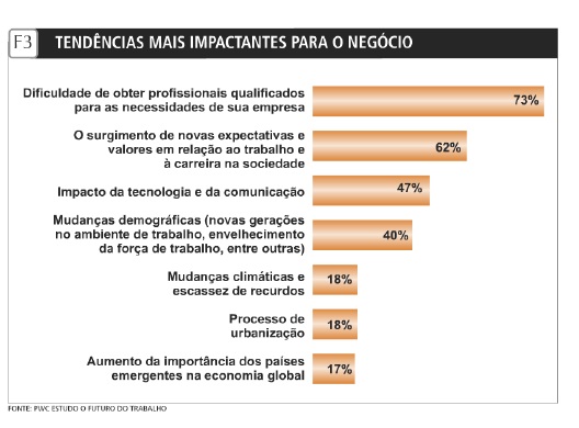 Dentre as questões elaboradas, quando se perguntou aos participantes qual das megatendências terá maior impacto na transformação dos seus negócios, nos próximos anos, a dificuldade em obter profissionais qualificados para as necessidades das empresas ficou em primeiro lugar, seguida do surgimento de novas expectativas e valores em relação ao trabalho e à carreira, na sociedade.
